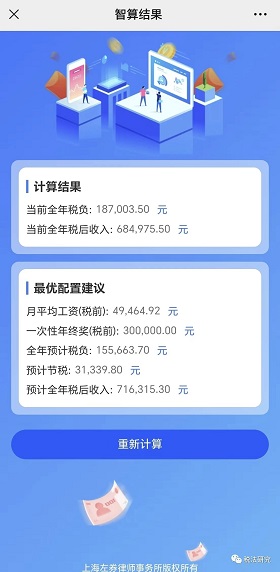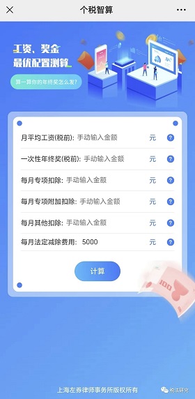 在全年收入不变的情形下,工资与全年一次性奖金如何配比才能实现税负最低、收入最大?上海期货交易所、上海左券律师事务所共同开发的“个税智算”程序即可帮您非常智能、准确地测出最优值,也可以模拟测算任意数值。